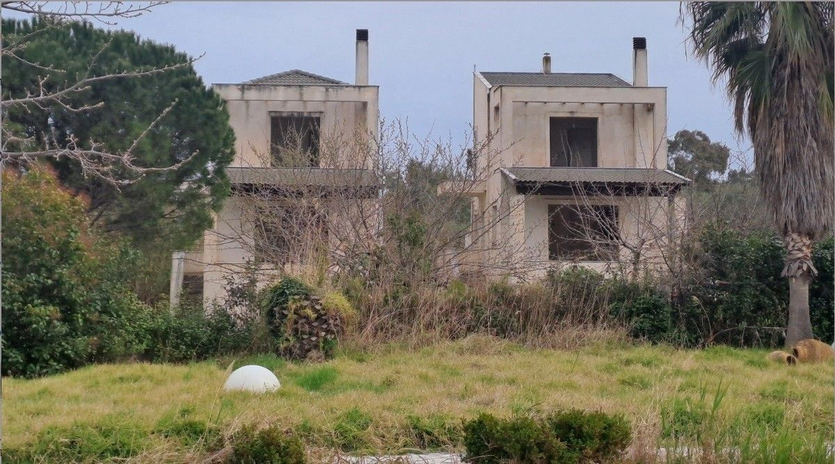 Σύμφωνα με την εξωτερική αυτοψία, πρόκειται για διώροφη οικοδομή, δύο διώροφες κατοικίες με υπόγειο (ημιτελείς) τυπικής κατασκευής με σκελετό από οπλισμένο σκυρόδεμα και πισίνα εντός του παραπάνω οικοπέδου. Η διώροφη οικοδομή βρίσκεται στο νοτιοδυτικό τμήμα του οικοπέδου, είναι σε καλή κατάσταση συντήρησης και διαθέτει εύκολη πρόσβαση τόσο από το βόρειο τμήμα (αιγιαλό) όσο και από το δυτικό. Βόρεια της διώροφης οικοδομής εντοπίζεται η πισίνα εμβαδού 85 τ.μ., ενώ νότια βρίσκεται κτίσμα πρόχειρης κατασκευής που εξυπηρετεί την στάθμευση αυτοκινήτων.