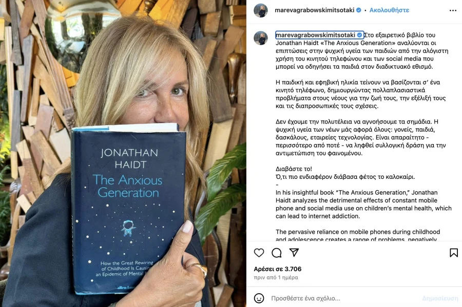 Δημοσίευσε ανάρτηση στην οποία προτείνει το «The Anxious Generation» του Jonathan Haidt.