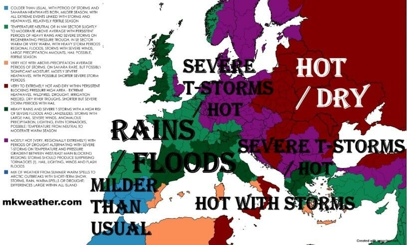 Σύμφωνα με την υπηρεσία μακροπρόθεσμης πρόγνωσης mkweather.com, η Δυτική Ευρώπη αναμένεται να βιώσει ένα δροσερό και θυελλώδες καλοκαίρι, ενώ τα ανατολικά και ηπειρωτικά τμήματα της ηπείρου φαίνεται πως θα ζήσουν ένα θερμό και ξηρό καλοκαίρι.