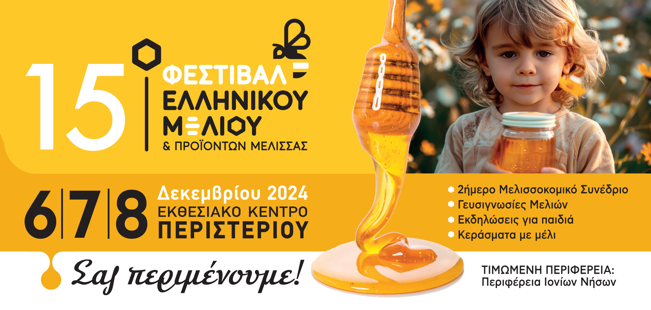Το μεγάλο γιορτινό ραντεβού του κόσμου της μελισσοκομίας, το 15ο Φεστιβάλ Ελληνικού Μελιού & Προϊόντων Μέλισσας, διοργανώνεται στις 6, 7 και 8 Δεκεμβρίου 2024, στο σύγχρονο Εκθεσιακό Κέντρο Περιστερίου.