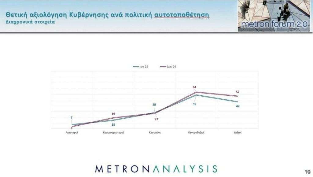 Σύμφωνα με τα στοιχεία που παρουσιάστηκαν, η κυβέρνηση κινείται σε επίπεδα κάτω από αυτά της αυτοδυναμίας, με την αντιπολίτευση να μην δείχνει ικανή να μπορεί να διαμορφώσει αντίπαλο πόλο διακυβέρνησης και την ακροδεξιά αθροιστικά να παρουσιάζει ανοδική δυναμική.