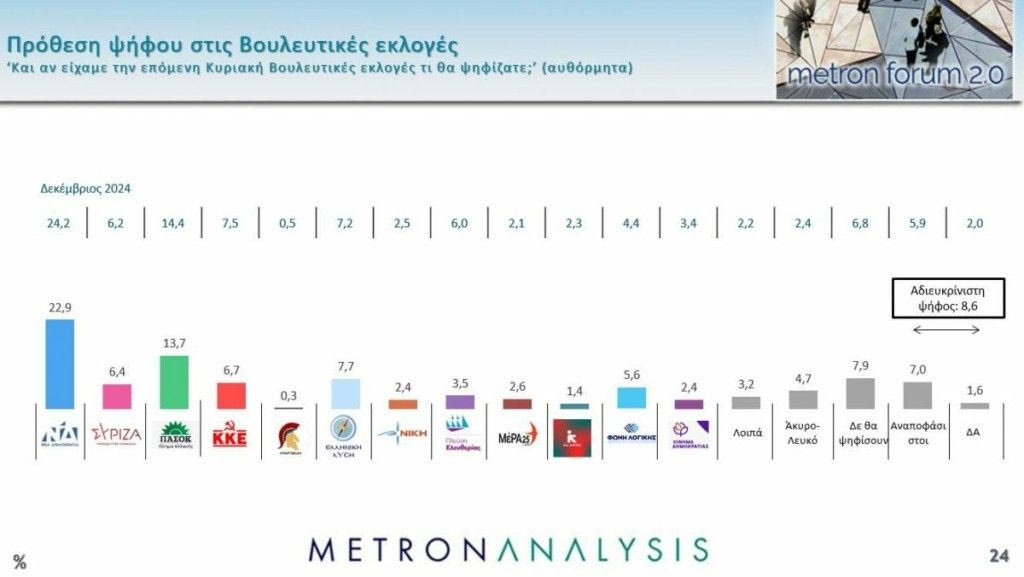 Στην πρόθεση ψήφου καταγράφεται μια υποχώρηση της Νέας Δημοκρατίας – που συνάδει με την αύξηση των αρνητικών αξιολογήσεων για την κυβέρνηση και τον πρωθυπουργό – από το 24,2% του Δεκεμβρίου στο 22,9%. Ο ΣΥΡΙΖΑ περίπου στα ίδια (6,4% από 6,2%), το ΠΑΣΟΚ στη δεύτερη θέση με υποχώρηση από το 14,4% στο 13,7%, η Ελληνική Λύση στην τρίτη θέση με 7,7%, πάνω από το ΚΚΕ που υποχώρησε στο 6,7%. Η Πλεύση Ελευθερίας καταγράφει μια υποχώρηση στο 3,5%, η Φωνή Λογικής ανεβαίνει στο 5,6% και το Κίνημα Δημοκρατίας υποχωρεί στο 2,4%.