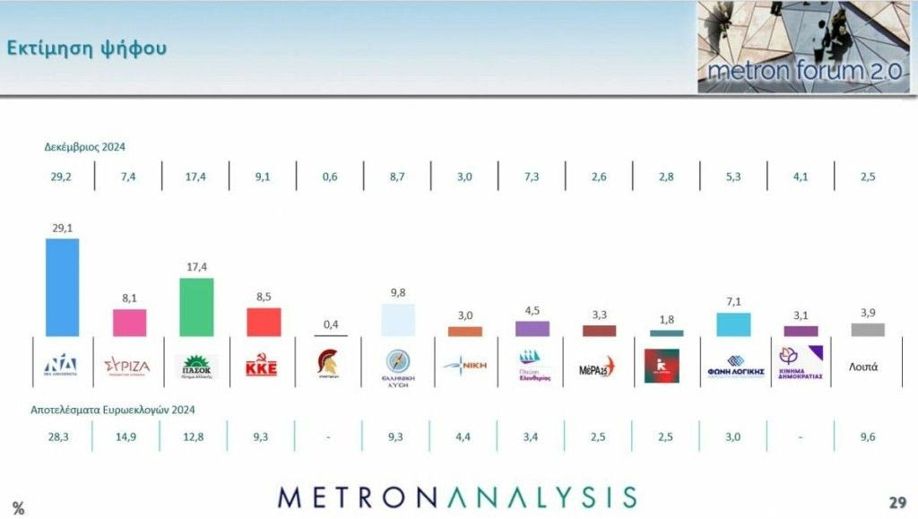 Στην εκτίμηση ψήφου της Metron Analysis, η Νέα Δημοκρατία κινείται στο 29,1%, το ΠΑΣΟΚ σταθερά στο 17,4%, την Ελληνική Λύση να ανεβαίνει στο 9,8%, το ΚΚΕ στο 8,5%, τον ΣΥΡΙΖΑ με μικρή άνοδο στο 8,1%, τη Φωνή της Λογικής στο 7,1%. Στο 4,5% η Πλεύση Ελευθερίας, στο 3,3% το ΜέΡΑ25, στο 3,11% το Κίνημα Δημοκρατίας του Στέφανου Κασσελάκη και στο 3% η Νίκη. Η Νέα Αριστερά εκτιμάται στο 1,8%.