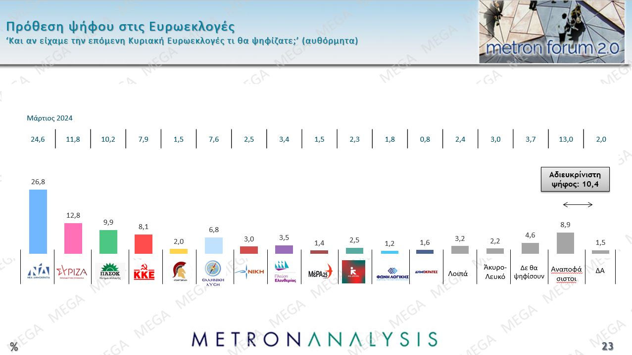 Μια τάση μερικής επανασυσπείρωσης γύρω από τη Νέα Δημοκρατία στην πορεία προς τις ευρωκλογές, αποτυπώνει η δημοσκόπηση της Metron Analysis για λογαριασμό του MEGA, όμως ταυτόχρονα καταγράφονται έντονα στοιχεία κοινωνικής δυσαρέσκειας, με την κυβέρνηση να μην καταφέρνει να αντιστρέψει το αρνητικό κλίμα για τις επιδόσεις της.