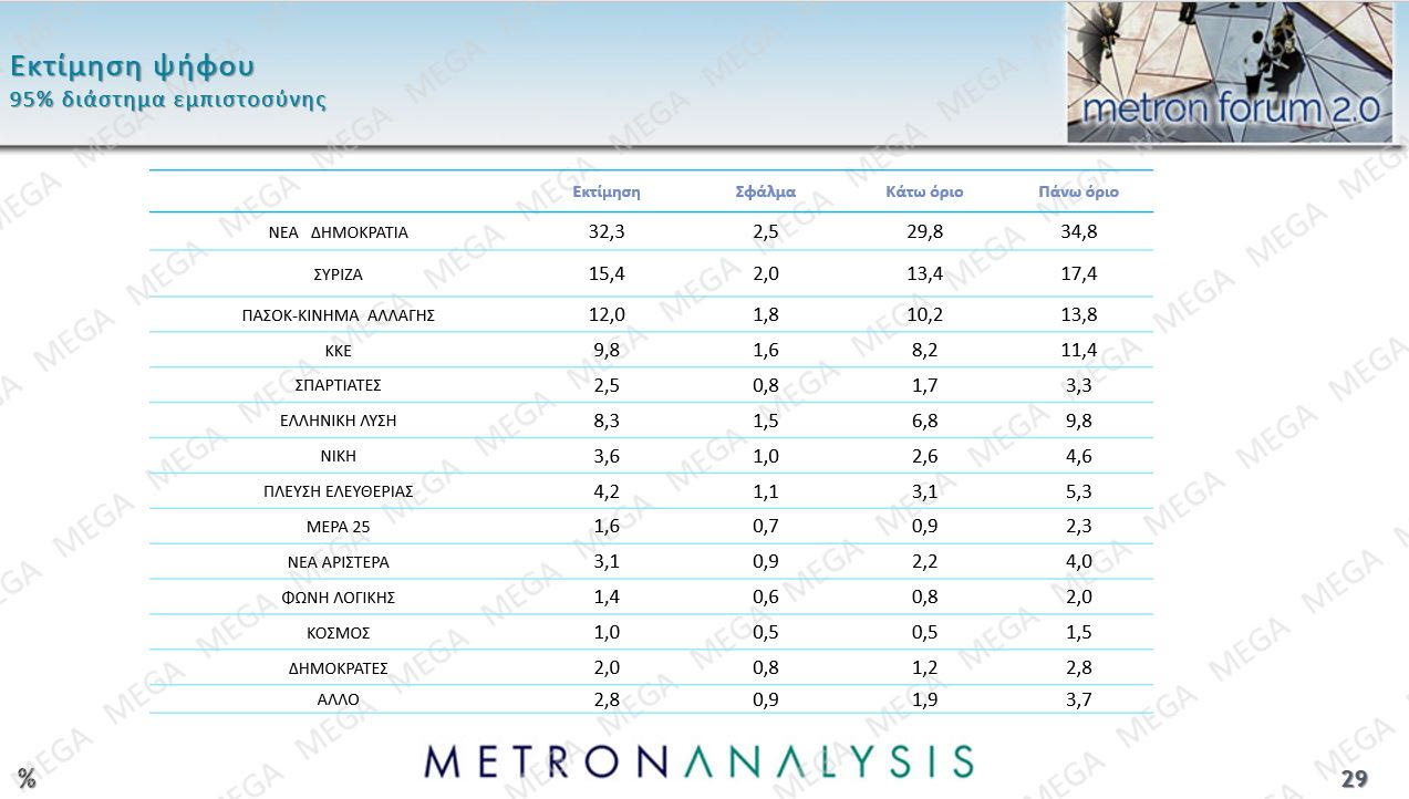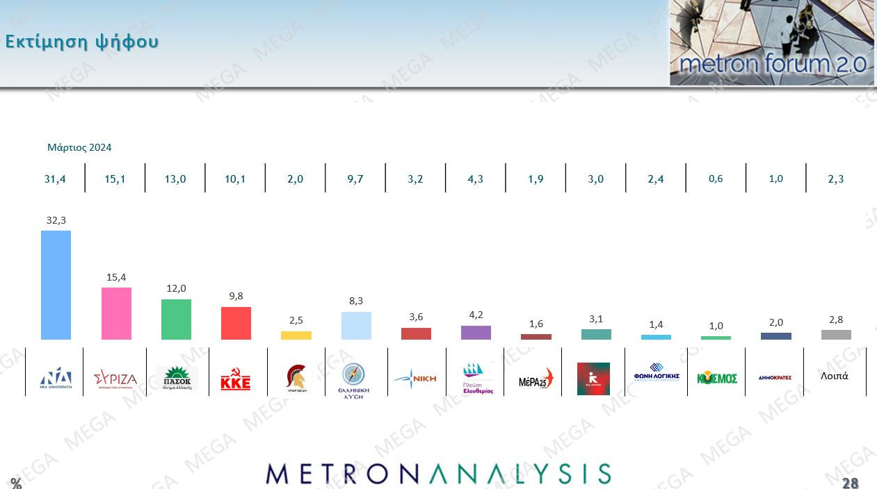 Στην εκτίμηση ψήφου, δηλαδή την εκτίμηση που κάνει η Metron Analysis για το πώς θα διαμορφωνόταν ένα ένδεχόμενο εκλογικό αποτέλεσμα, έχουμε μια άνοδο της συσπείρωσης της ΝΔ που μεταφράζεται σε άνοδο 0,9%, μια νέα άνοδο του ΣΥΡΙΖΑ στο 15,4%, μια υποχώρηση του ΠΑΣΟΚ κατά 1% και μια σταθερότητα ουσιαστικά του ΚΚΕ. Η Ελληνική Λύση καταγράφει μια υποχώρηση στο 8,3%, ενώ η εκτίμηση είναι περνούν το όριο η Νίκη, η Πλεύση Ελευθερίας και οριακά η Νέα Αριστερά, όχι όμως κάποιο άλλο κόμμα.