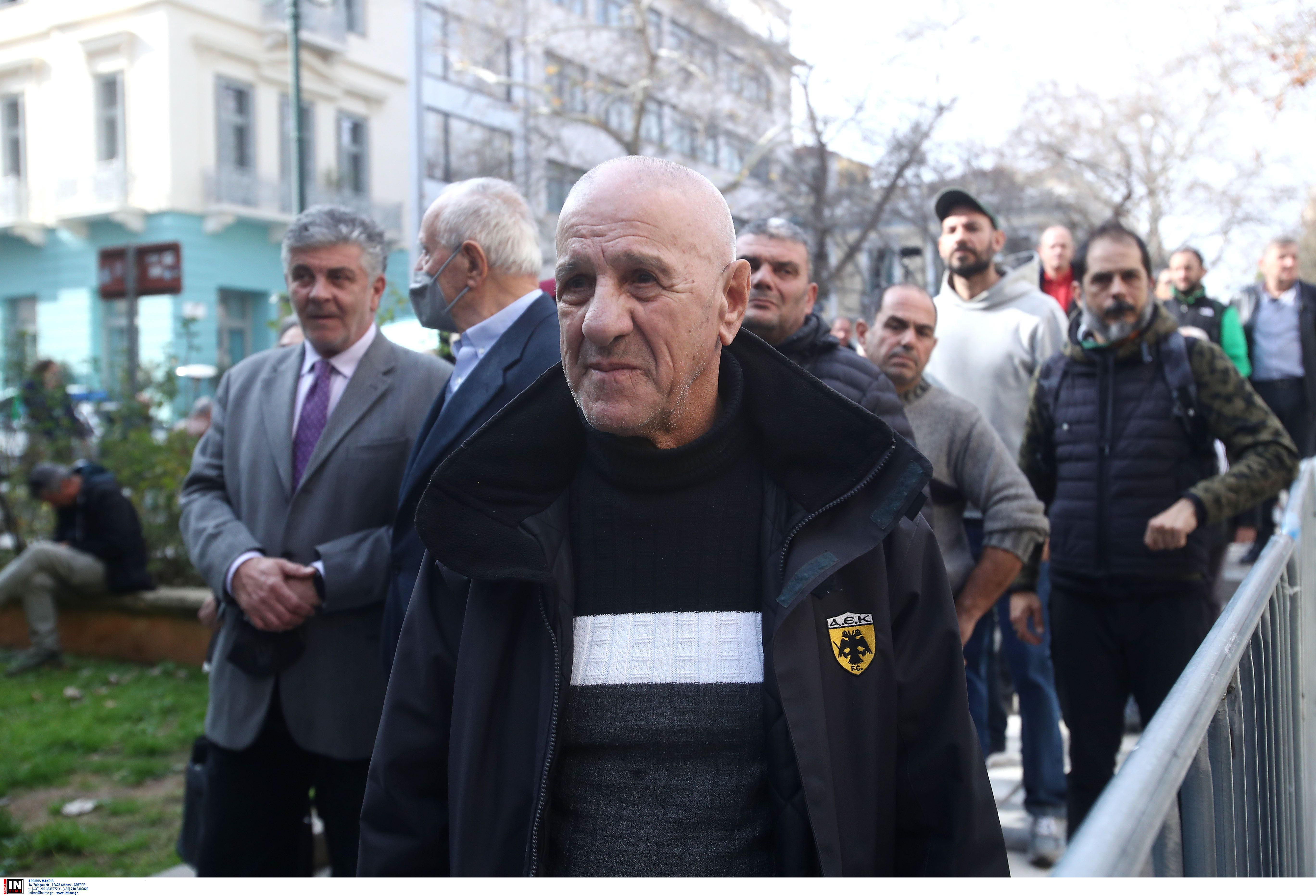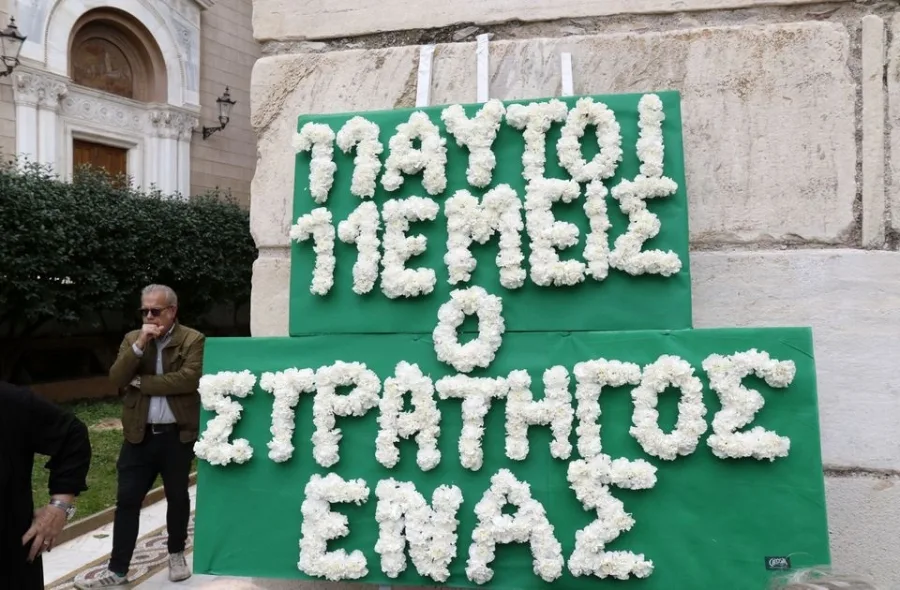 Πλήθος κόσμου μετά το παρεκκλήσι της Μητρόπολης Αθηνών μετακινήθηκαν δίπλα στον μητροπολιτικό ναό προκειμένου να αποχαιρετήσουν τον Μίμη Δομάζο, ενώ ο χώρος έχει γεμίσει με στεφάνια. Ένα από αυτά μάλιστα αναφέρει «11 αυτοί 11 εμείς, ο στρατηγός ένας».