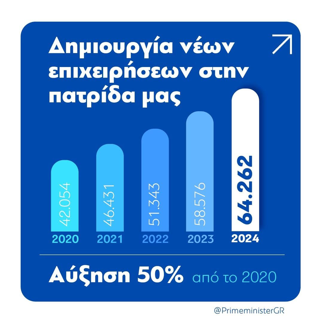 «Η πρώτη ανάρτηση για το 2025 αφορά την επιχειρηματικότητα. Το 2024 ήταν μια χρονιά-ορόσημο για το ελληνικό επιχειρείν, καθώς σύμφωνα με τα στοιχεία του ΓΕΜΗ, ιδρύθηκαν 64.262 νέες επιχειρήσεις, καταγράφοντας αύξηση 11% σε σχέση με το 2023. Πρόκειται για το υψηλότερο επίπεδο των τελευταίων ετών, με μια συνολική αύξηση 50% σε σχέση με το 2020.
