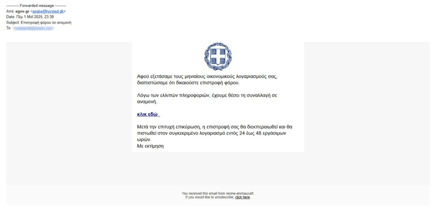 Στο mail με αποστολέα το «egov.gr» που παρουσιάζει το protothema.gr υπάρχει το έμβλημα της ελληνικής κυβέρνησης και θέμα έχει «επιστροφή φόρου σε αναμονή».
