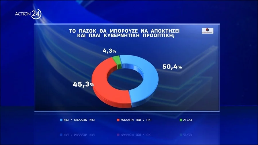 Μοιρασμένοι είναι οι πολίτες και στην ερώτηση για το εάν το ΠΑΣΟΚ θα μπορούσε να αποκτήσει ξανά κυβερνητική προοπτική, με το 50,4% να απαντά «ναι/μάλλον ναι», το 45,3% «όχι/μάλλον όχι» και το 4,3% δεν γνωρίζει ή δεν απαντά.