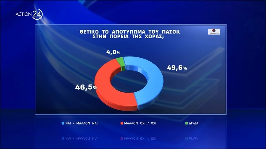 Με αφορμή την εκλογική μάχη του Οκτωβρίου στο ΠΑΣΟΚ, το γκάλοπ θέτει το ερώτημα για το αποτύπωμα του κόμματος στην πορεία της χώρας, με τους συμμετέχοντες να είναι σχεδόν μοιρασμένοι, καθώς το 49,6% το κρίνει «θετικό ή μάλλον θετικό», το 46,5% «αρνητικό ή μάλλον αρνητικό», ενώ το 4% δεν γνωρίζει ή δεν απαντά.
