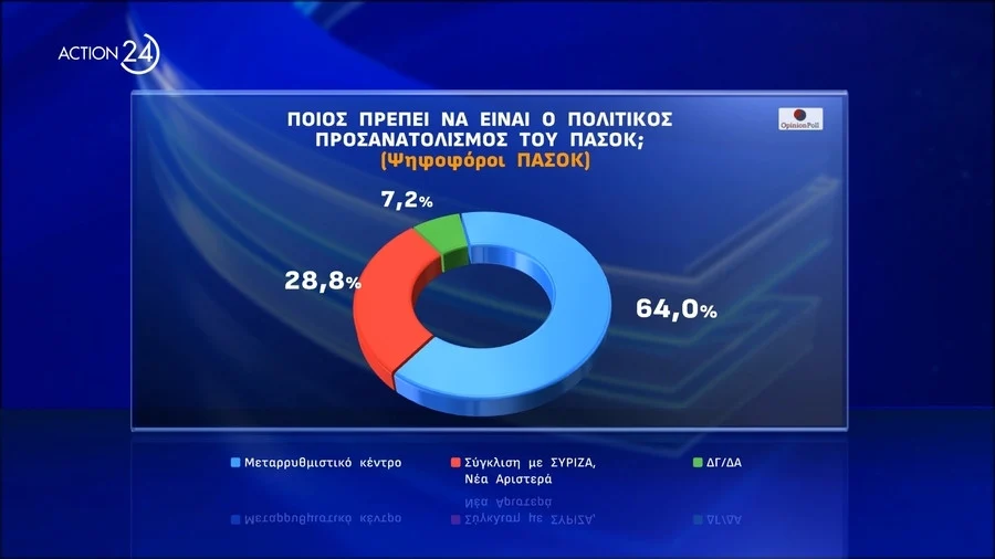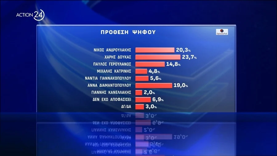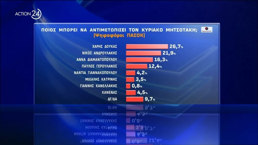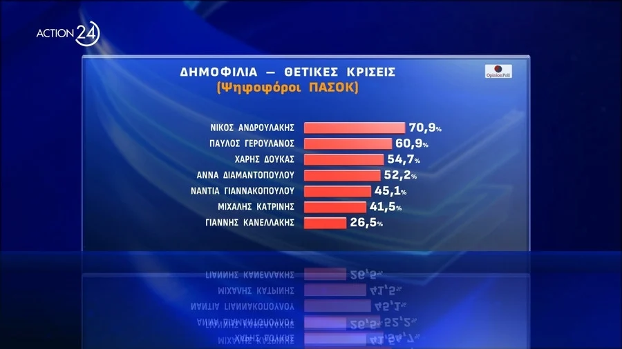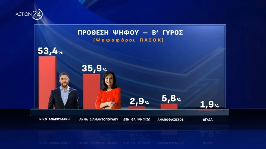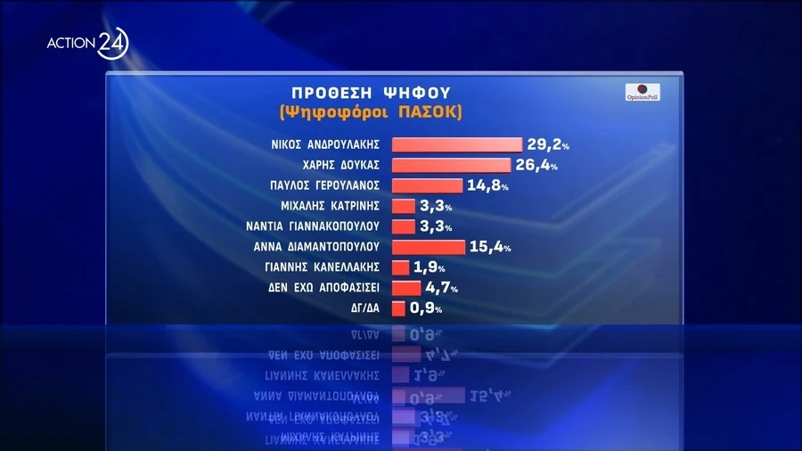 Σκληρό ντέρμπι Ανδρουλάκη – Δούκα για την προεδρία του ΠΑΣΟΚ, με Διαμαντοπούλου και Γερουλάνο να ακολουθούν, σύμφωνα με δημοσκόπηση της Opinion Poll για λογαριασμό του Action 24.