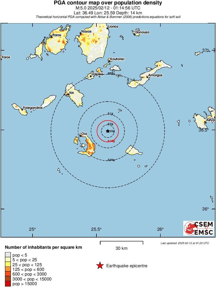 Σεισμική δόνηση μεγέθους 5 βαθμών της κλίμακας Ρίχτερ, σύμφωνα με την αυτόματη λύση του Ευρωπαϊκού – Μεσογειακού Σεισμολογικού Ινστιτούτου (EMSC), σημειώθηκε στις 03:14 μετά τα μεσάνυχτα (Τετάρτη 12/2), σε υποθαλάσσια περιοχή, κοντά σε Σαντορίνη και Αμοργό.