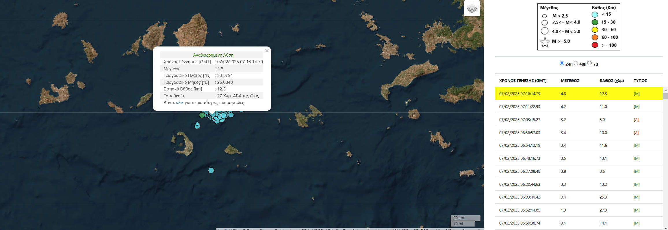 Σύμφωνα με το Γεωδυναμικό Ινστιτούτο, το επίκεντρο του σεισμού εντοπίστηκε 24 χλμ. βόρεια της Ανάφης