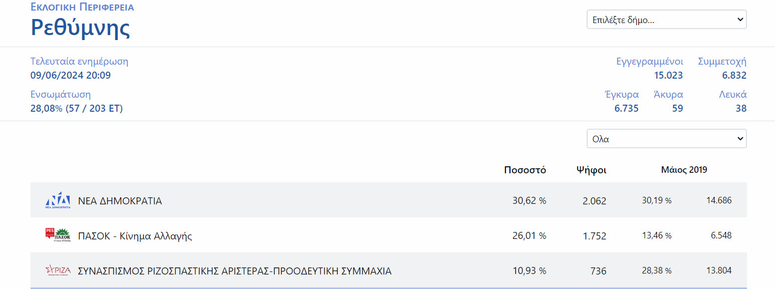 ΕΛΛΑΔΑ Ντέρμπι στο Ρέθυμνο ανάμεσα σε ΝΔ και ΠΑΣΟΚ Στο 28% της ενσωμάτωσης Αίθουσα Σύνταξης Κυριακή, 9 Ιουνίου 2024, 20:21 share this on facebook share this on twitter Προβάδισμα με 30% της ΝΔ έναντι του 26% του ΠΑΣΟΚ. Στο 10% το ΣΥΡΙΖΑ