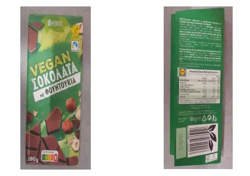 Πρόκειται για το προϊόν «VEGAN ΣΟΚΟΛΑΤΑ ΜΕ ΦΟΥΝΤΟΥΚΙΑ, VEMONDO» σε συσκευασία των 180gr, με αριθμό παρτίδας L 34161a και ημερομηνία ανάλωσης κατά προτίμηση, πριν από 15.04.25 που διακινείται από την Εταιρεία Lidl Hellas.