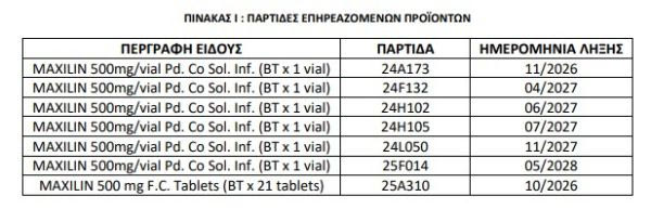 Την ανάκληση των παρτίδων των φαρμακευτικών προϊόντων MAXILIN PD. SOL. INF. 500mg/vial και MAXILIN 500mg/tab του συνημμένου πίνακα Ι, που περιέχουν τη δραστική α’ ύλη Claricomythrin παραγωγής του εργοστασίου SM BIOMED SDN BHD Μαλαισίας, λόγω ανάκλησης του Πιστοποιητικού CEP.
