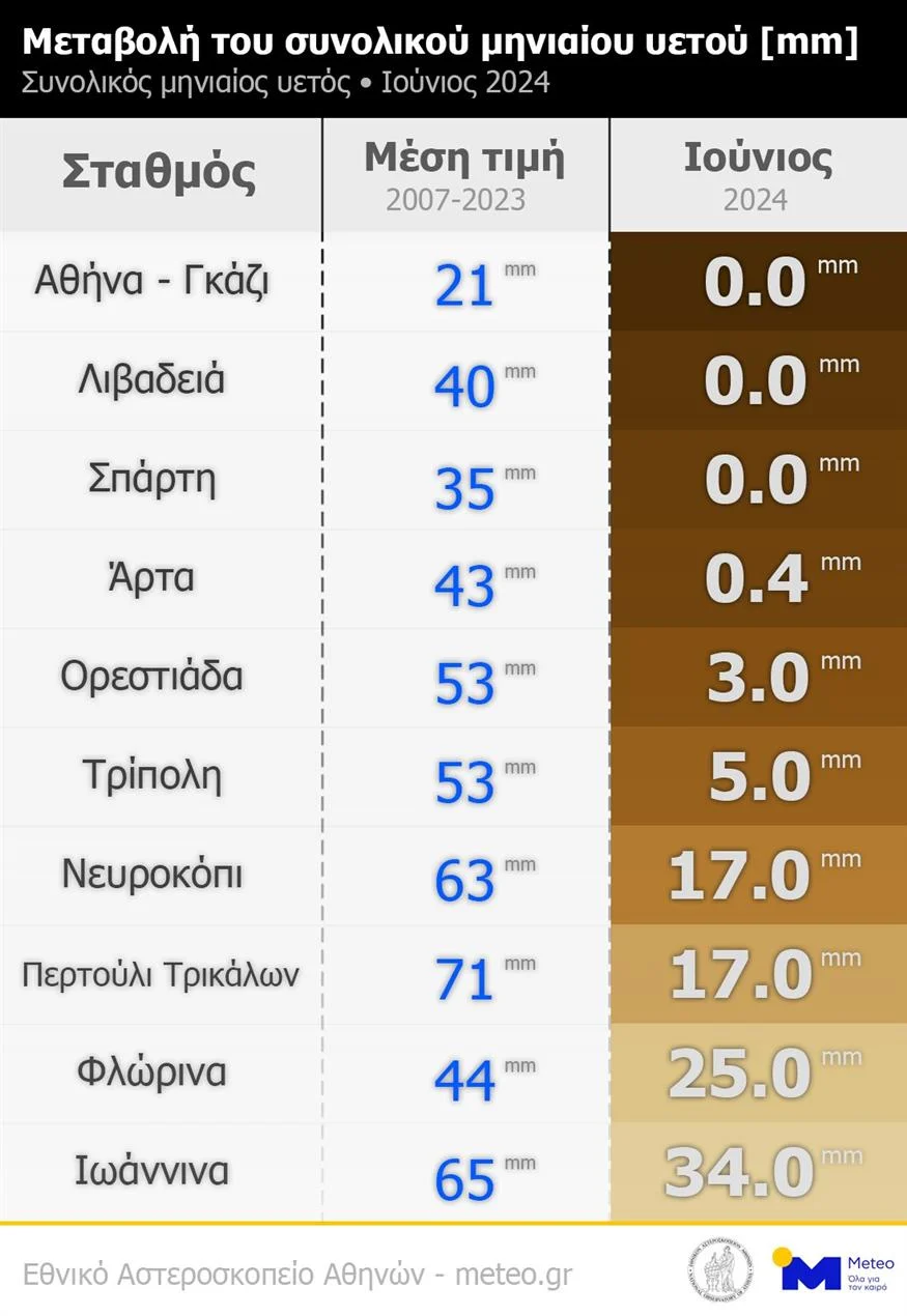 Στο κέντρο της Αθήνας δεν έβρεξε καθόλου τον φετινό Ιούνιο (ο Ιούνιος του 2012 ήταν ο τελευταίος μήνας με μηδενική βροχή). Μηδενική ήταν η βροχή και στη Λιβαδειά και τη Σπάρτη. Επίσης, ακόμη και σε περιοχές με υψηλές τιμές βροχόπτωσης, σύμφωνα με τη μέση τιμή της περιόδου 2017-2023, οι βροχές ήταν ελάχιστες.