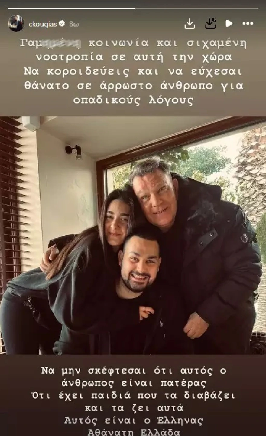 Ειδικότερα, ο Χρήστος Κούγιας αναρτώντας μία οικογενειακή φωτογραφία με τον πατέρα και την αδελφή του, έγραψε σε έντονο ύφος: