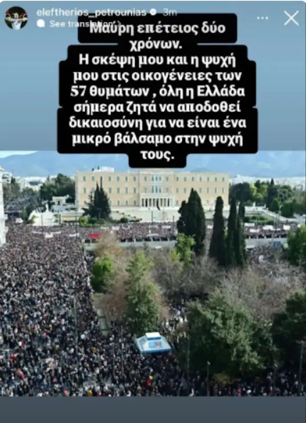 Βλέποντας τις μαζικές διαδηλώσεις που υπήρξαν σε Αθήνα, Θεσσαλονίκη και άλλες πόλεις της Ελλάδας -με τους πολίτες να ζητάνε δικαιοσύνη για τα 57 θύματα του σιδηροδρομικού δυστυχήματος των Τεμπών- ο Λευτέρης Πετρούνιας δημοσίευσε φωτογραφία από τη μεγαλειώδη συγκέντρωση στο Σύνταγμα.