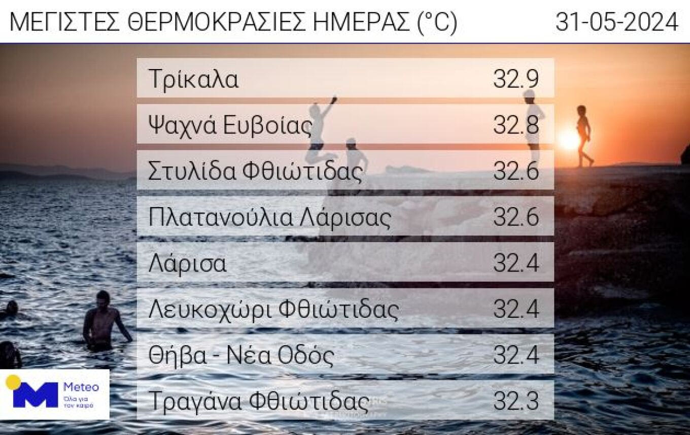 Η μέγιστη θερμοκρασία ήταν ίση με 32.9 βαθμούς και καταγράφηκε στον μετεωρολογικό σταθμό των Τρικάλων.