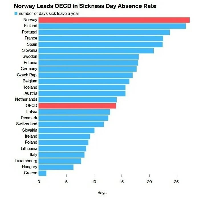 Oι Γερμανοί είναι «πρωταθλητές» στις αναρρωτικές άδειες, με 25 ημέρες ετησίως, πολύ περισσότερες από τις 14 του μέσου όρου της Ευρωπαϊκής Ένωσης ή τις 9 των Ελβετών, τις 6 των Βρετανών και, φυσικά, τις 4 των Ελλήνων.