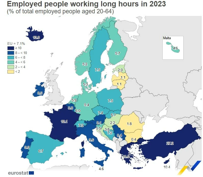 Παράλληλα, σύμφωνα με τη Eurostat το 2023, από τις χώρες της ΕΕ, η Ελλάδα είχε το υψηλότερο ποσοστό εργαζομένων με πολλές ώρες στην εργασία τους (11,6%), ακολουθούμενη από την Κύπρο (10,4%) και τη Γαλλία (10,1%). Εν τω μεταξύ, τα χαμηλότερα ποσοστά καταγράφηκαν στη Βουλγαρία (0,4%), τη Λιθουανία και τη Λετονία (1,1% η καθεμία).