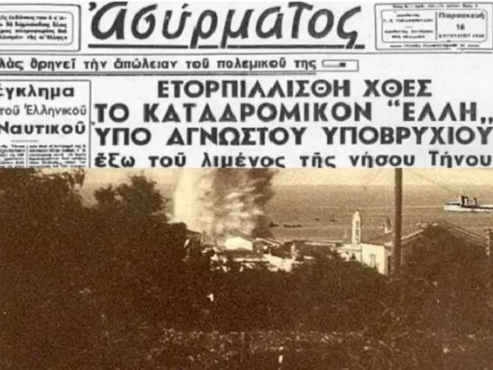 Το ελληνικό καταδρομικό «Έλλη», αγκυροβολημένο στο λιμάνι της Τήνου για τον Δεκαπενταύγουστο, δέχτηκε αιφνιδιαστική επίθεση από το ιταλικό υποβρύχιο «Delfino». Η τορπίλη το χτύπησε κατά μέτωπο, σε μια εχθρική ενέργεια που έγινε σχεδόν τρεις μήνες πριν την επίσημη κήρυξη πολέμου με την Ιταλία. Ήταν το πρώτο άμεσο πλήγμα της χώρας από τις δυνάμεις του Άξονα.