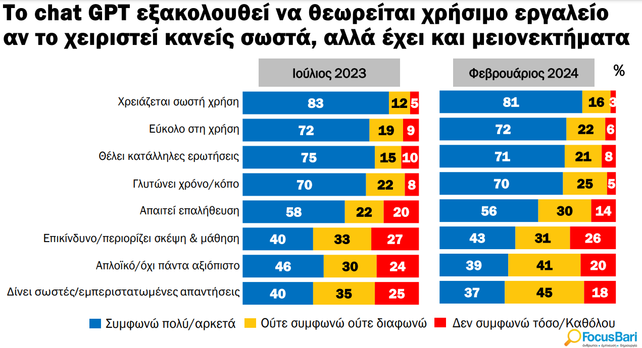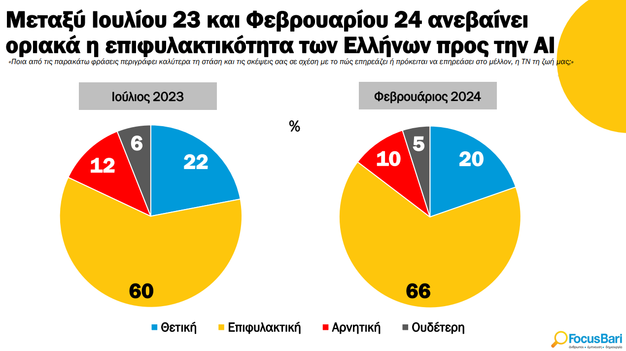 Σύμφωνα με πανελλαδική έρευνα της Focus Bari, το 66% των ερωτηθέντων αυτό τον μήνα δήλωσε επιφυλακτικό, έναντι 60% στην προηγούμενη αντίστοιχη δημοσκόπηση του Ιουλίου του 2023. Βέβαια, το ποσοστό των Ελλήνων με αρνητική στάση απέναντι στην ΑΙ συρρικνώθηκε ελαφρώς και διαμορφώθηκε στο 10% έναντι 12% στην προηγούμενη δημοσκόπηση.