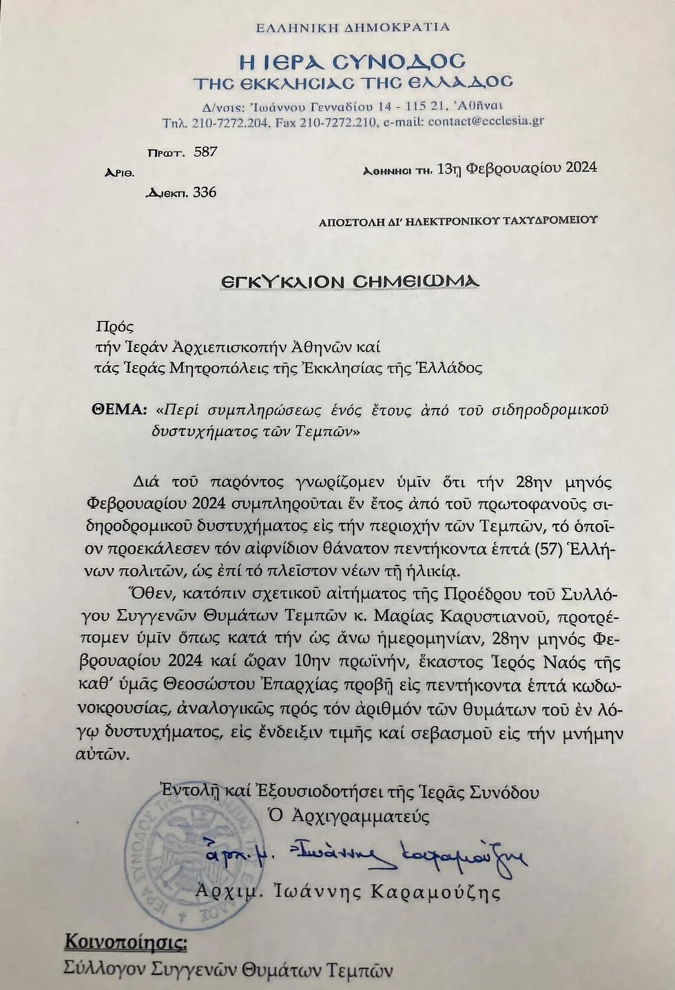 Αφότου έγινε δεκτό το αίτημά της, η Ιερά Σύνοδος της Εκκλησίας της Ελλάδας με ανακοίνωσή της ενημέρωσε όλες τις εκκλησίες της Ελλάδας για αυτή την πρωτοβουλία. Με ανάρτησή της στα μέσα κοινωνικής δικτύωσης η κα. Καρυστιανού αναφέρει πως: «Ζητήσαμε από την Ιερά Αρχιεπισκοπή Αθηνών να ηχήσουν πένθιμα οι καμπάνες αύριο… Ευχαριστούμε από καρδιάς για την αποδοχή και την υλοποίηση της παράκλησης μας. Εξάλλου είμαστε πια βέβαιοι πως τίποτε δεν είναι αυτονόητο στη ζωή μας και τίποτε δεδομένο. Ένας χτύπος και ένα τρισάγιο λοιπόν, για κάθε ψυχή που έφυγε ένα χρόνο πριν στην κοιλάδα των Τεμπών».