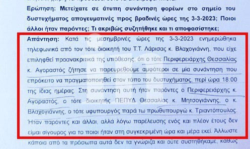 Στην δικογραφία αυτή επιβεβαιώνονται κατά απόλυτο τρόπο τα ρεπορτάζ του in και του τηλεοπτικού σταθμού Mega για άτυπη, άγνωστη μέχρι πρόσφατα, σύσκεψη που υπήρξε το απόγευμα της 3ης Μαρτίου 2023 στο σημείο της τραγωδίας με την παρουσία του τότε υφυπουργού παρ;a τω πρωθυπουργώ κ. Χ. Τριαντόπουλου, του γενικού γραμματέα του Υπουργείου Μεταφορών κ. Γ. Ξιφαρά, του τότε περιφερειάρχη Θεσσαλίας κ. Κ. Αγοραστού , του γενικού γραμματέα Πολιτικής Προστασίας κ. Β. Παπαγεωργίου όπως κι αξιωματικών της ΕΛ.ΑΣ., στελεχών του ΟΣΕ κλπ.