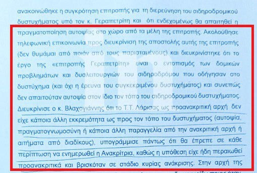 Ακολούθησε τηλεφωνική επικοινωνία προς διευκρίνιση της αποστολής αυτής της επιτροπής (δεν θυμάμαι από ποιόν από τους παρισταμένους) και διευκρινίστηκε ότι το έργο της «επιτροπής Γεραπετρίτη» είναι ο εντοπισμός των δομικών προβλημάτων και δυσλειτουργιών του σιδηροδρόμου που οδήγησαν στο δυστύχημα , κι όχι η έρευνα του συγκεκριμένου δυστυχήματος. Και συνεπώς δεν απαιτούνταν αυτοψία στον ίδιο τόπο του σιδηροδρομικού δυστυχήματος. . Ακόμη η ο διοικητής της Τροχαίας Λάρισας διευκρίνισε ότι ως προανακριτική αρχή δεν είχε καποια άλλη εκκρεμότητα ως προς τον τόπο του δυστυχήματος (αυτοψία, πραγματογνωμοσύνη ή κάποια άλλη παραγγελία από την ανακριτική αρχή ή αιτήματα από διαδίκους) , υπογράμμισε πάντως ότι θα έπρεπε σε κάθε περίπτωση να ενημερωθεί η ανακρίτρια , καθώς η υπόθεση είχε ήδη περαιωθεί προανακριτικά και βρισκόταν σε στάδιο κυρίας ανάκρισης».