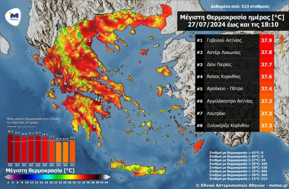 Μικρή άνοδο της θερμοκρασίας κατέγραψε το δίκτυο αυτόματων μετεωρολογικών σταθμών του meteo.gr/Εθνικού Αστεροσκοπείου Αθηνών το Σάββατο (27/7).