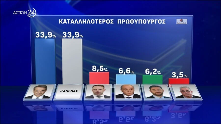 Στην καταλληλότητα για Πρωθυπουργός Κ. Μητσοτάκης και ο ΚΑΝΕΝΑΣ εμφανίζονται με την ίδια επίδοση της ταξης του 33.9%. Ο Κ. Μητσοτάκης χάνει 2.1% , ο ΚΑΝΕΝΑΣ αυξάνει και αυτό φέρνει ως αποτέλεσμα την ισοπαλία. Οι άλλοι Πολιτικοί Αρχηγοί ακολουθούν με μικρές αυξομοιώσεις με τις εξής επιδόσεις και την σειρά που αναφέρονται : Σ. Κασσελάκης 8.5% ( 8%), Κ. Βελόπουλος 6.6% ( 5.3%), Ν. Ανδρουλάκης 6.2% ( 6.1%), Δ. Κουτσούμπας 3.5% ( 3.3%), Ζ. Κωνσταντοπούλου 3% ( 3.1%), Β. Στίγκας 0.6% ( 0.5%), Δ. Νατσιός 0.5% ( 2%) , Α. Χαρίτσης 0.5% 9 1.1%) .