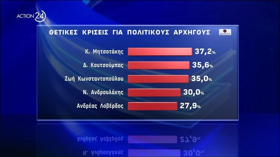 Στην δημοφιλία των Πολιτικών Αρχηγών προηγείται ο Κ. Μητσοτάκης με 37.2% ( 37.6%) και ακολουθούν ο Δ. Κουτσούμπας με 35.6% ( 33.7%), η Ζωή Κωνσταντοπούλου με 35% ( 28.4%) , ο Ν. Ανδρουλάκης με 30% ( 28.9%), Α. Λοβέρδος με 27.9% ( 29.8%), Κ. Βελόπουλος με 27% ( 27.6%), Σ. Κασσελάκης με 26.9% ( 23.2%) Α. Χαρίτσης με 19% ( 18.8% ), Δ. Νατσιός με 10.9% ( 13.8%) και Β Στίγκας με 6.2% ( 7.5%). Τις συγκριτικά πιο σημαντικές αυξησεις δημοφιλίας παρουσιάζουν η Ζ. Κωνσταντοπούλου και ο Σ. Κασσελάκης.