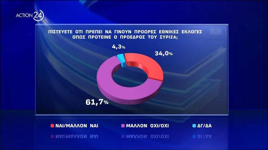 Το 61.7% απορρίπτει την πρόταση του Σ. Κασσελάκη για προκήρυξη πρόωρων εκλογών. Την υιοθετεί το 34.3% ( 60.7% ανάμεσα στους ψηφοφόρους του ΣΥΡΙΖΑ). Στα κομματικά ακροατήρια πλειοψηφικά τάσσονται υπέρ αυτής στον ΣΥΡΙΖΑ, ΕΛΛΗΝΙΚΗ ΛΥΣΗ, ΠΛΕΥΣΗ ΕΛΕΥΘΕΡΙΑΣ και ΣΠΑΡΤΙΑΤΕΣ.