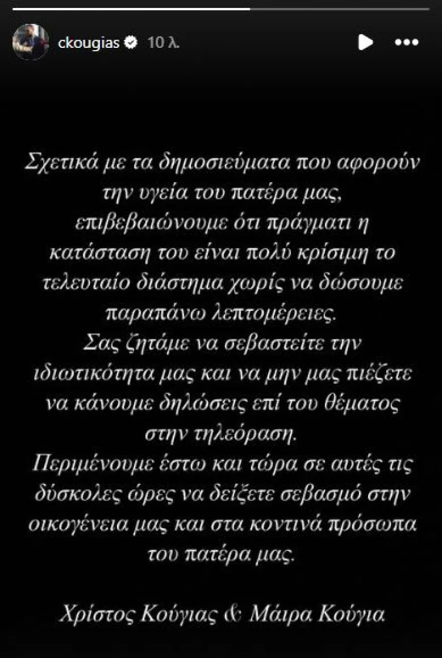 Τα δυο παιδιά του, ο Χρήστος και η Μάιρα Κούγια με μια ανάρτηση στα social media επιβεβαίωσαν τις φήμες που κυκλοφορούσαν για τον μπαμπά τους, εδώ και μέρες γράφοντας: «Σχετικά με δημοσιεύματα που αφορούν την υγεία του πατέρα μας, επιβεβαιώνουμε ότι πράγματι η κατάστασή του είναι πολύ κρίσιμη το τελευταίο διάστημα, χωρίς να δώσουμε παραπάνω λεπτομέρειες. Σας ζητάμε να σεβαστείτε την ιδιωτικότητά μας και να μην μας πιέζετε να κάνουμε δηλώσεις επί του θέματος στην τηλεόραση. Περιμένουμε, έστω και τώρα σε αυτές τις δύσκολες ώρες, να δείξετε σεβασμό στην οικογένειά μας και στα κοντινά πρόσωπα του πατέρα μας».