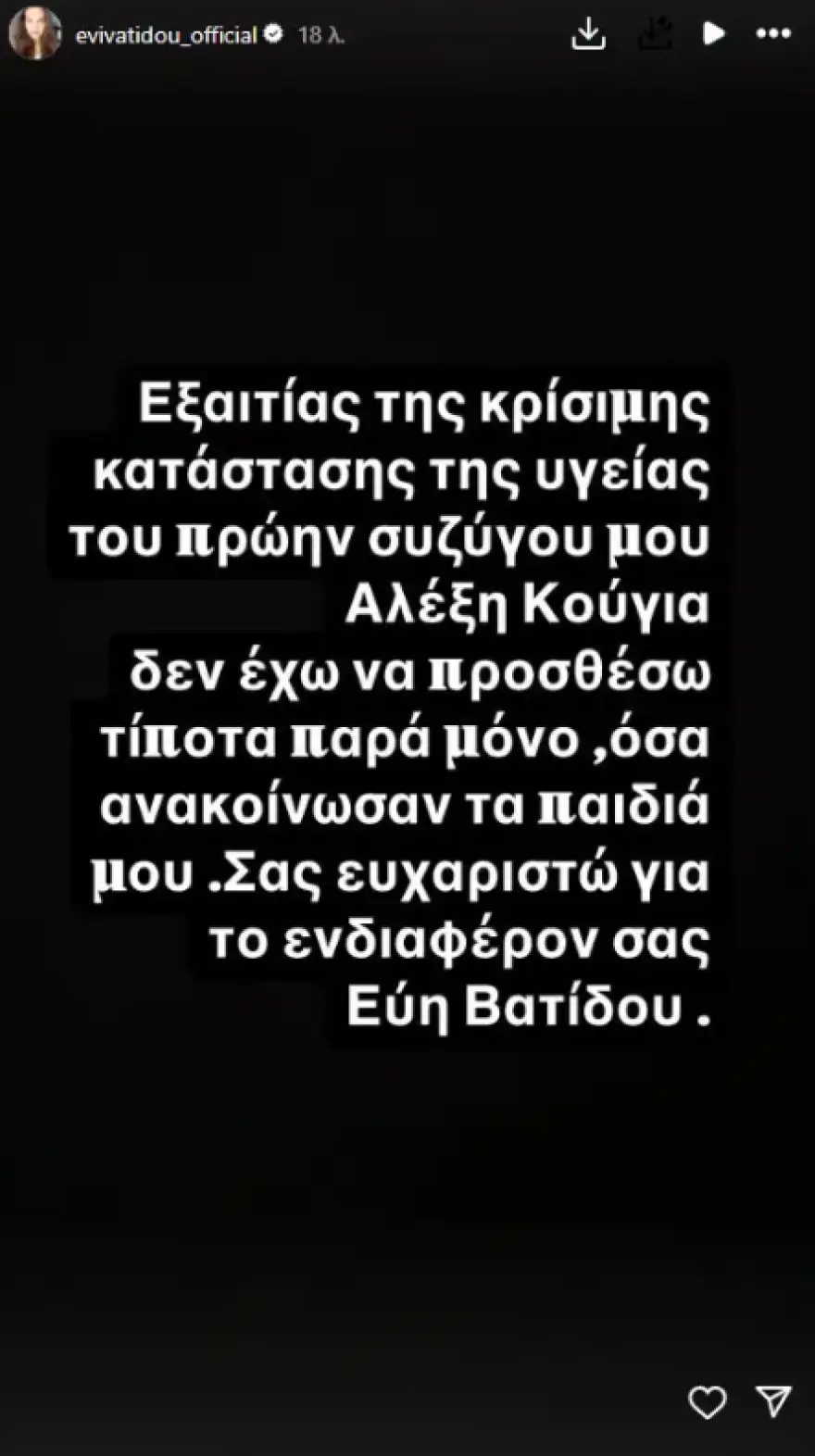 Λίγη ώρα αργότερα και η πρώην σύζυγος του Εύη Βατίδου προχώρησε σε μια ανάρτηση συντασσόμενη με τα παιδιά της σε αυτό το τόσο σοβαρό θέμα που αφορά την οικογένεια τους, στην οποία αναφέρει: «Εξαιτίας της κρίσιμης κατάστασης της υγείας του πρώην συζύγου μου, Αλέξη Κούγια, δεν έχω να προσθέσω τίποτα, παρά μόνο όσα ανακοίνωσαν τα παιδιά μου. Σας ευχαριστώ για το ενδιαφέρον σας».