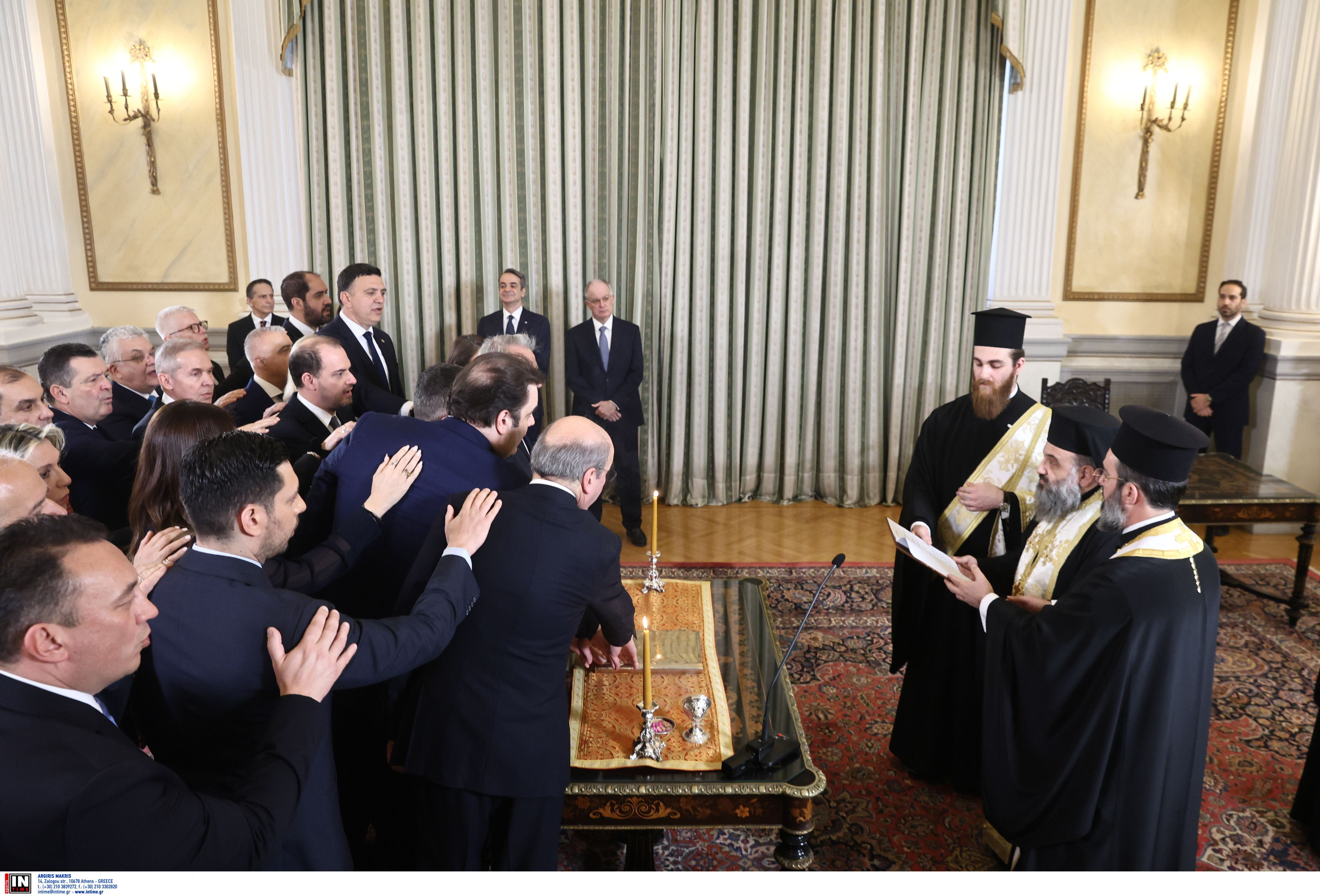 Μετά τις 10:30 το πρωί του Σαββάτου, οι νέοι υπουργοί και υφυπουργοί της κυβέρνησης άρχισαν να προσέρχονται στο Προεδρικό Μέγαρο για την ορκωμοσία παρουσία του νέου Προέδρου της Δημοκρατίας, Κωνσταντίνου Τασούλα. Της τελετής ορκωμοσίας χοροστάτησε ο αρχιμανδρίτης Ιωάννης Καραμούζης καθώς ο Αρχιεπίσκοπος Αθηνών και Πάσης Ελλάδος Ιερώνυμος έχει μεταβεί στη Θεσσαλονίκη για την κηδεία του μακαριστού Μητροπολίτη πρώην Θεσσαλονίκης Άνθιμου.