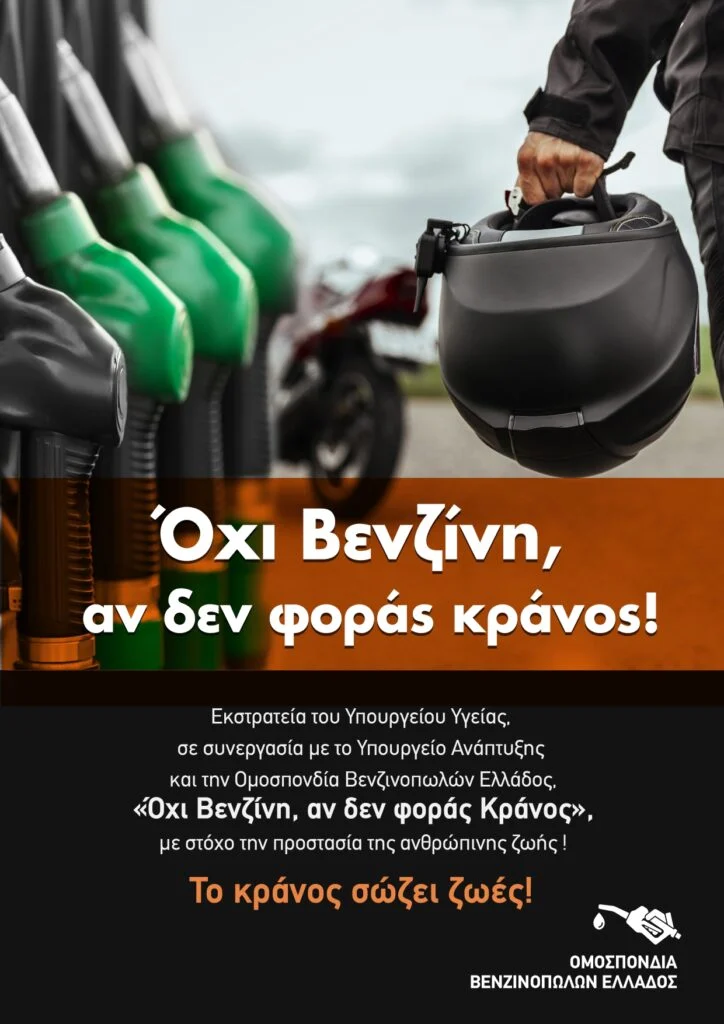 Η Ομοσπονδία Βενζινοπωλών Ελλάδος, χαιρέτησε από την πρώτη στιγμή την εκστρατεία «Όχι βενζίνη αν δεν φοράς κράνος», αναφέρει σε σχετική ανακοίνωση υπενθυμίζοντας ότι ξεκίνησε με πρωτοβουλία πρατηριούχου στην Κίσσαμο Κρήτης που έπαυσε να εξυπηρετεί μοτοσικλετιστές χωρίς κράνος μετά από δυστύχημα με θύμα 17χρονο αναβάτη.