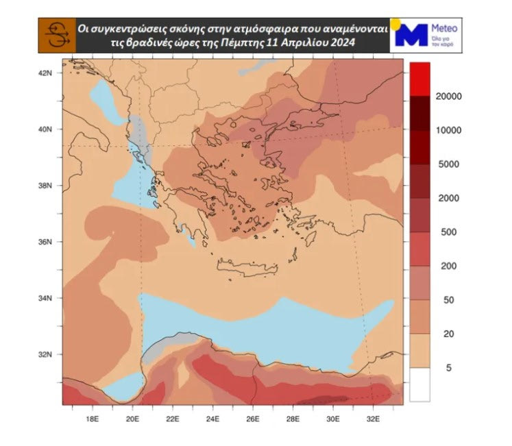 Στον χάρτη που ακολουθεί παρουσιάζονται ενδεικτικά οι εκτιμώμενες συγκεντρώσεις ατμοσφαιρικής σκόνης, κατά τη διάρκεια των βραδινών ωρών της Πέμπτης 11/4.