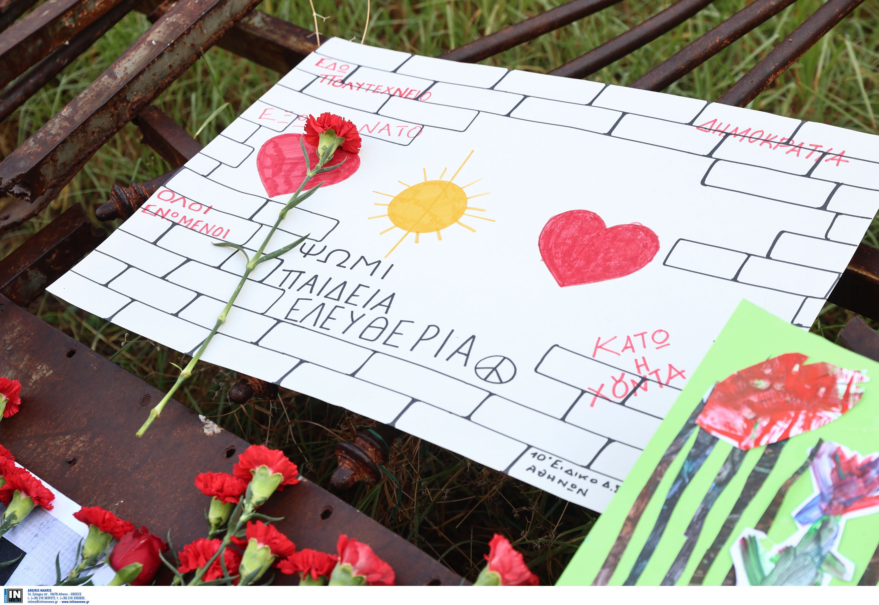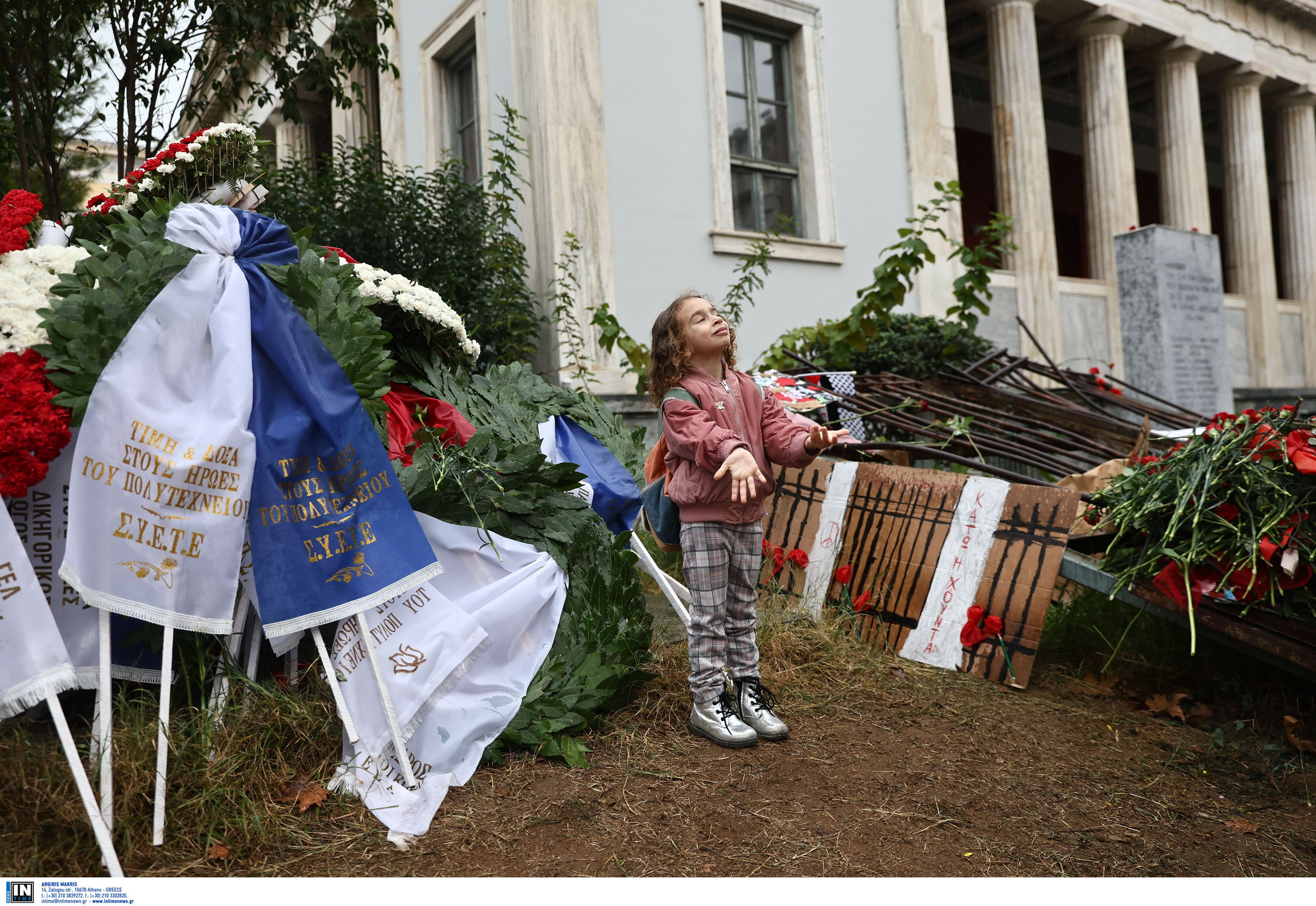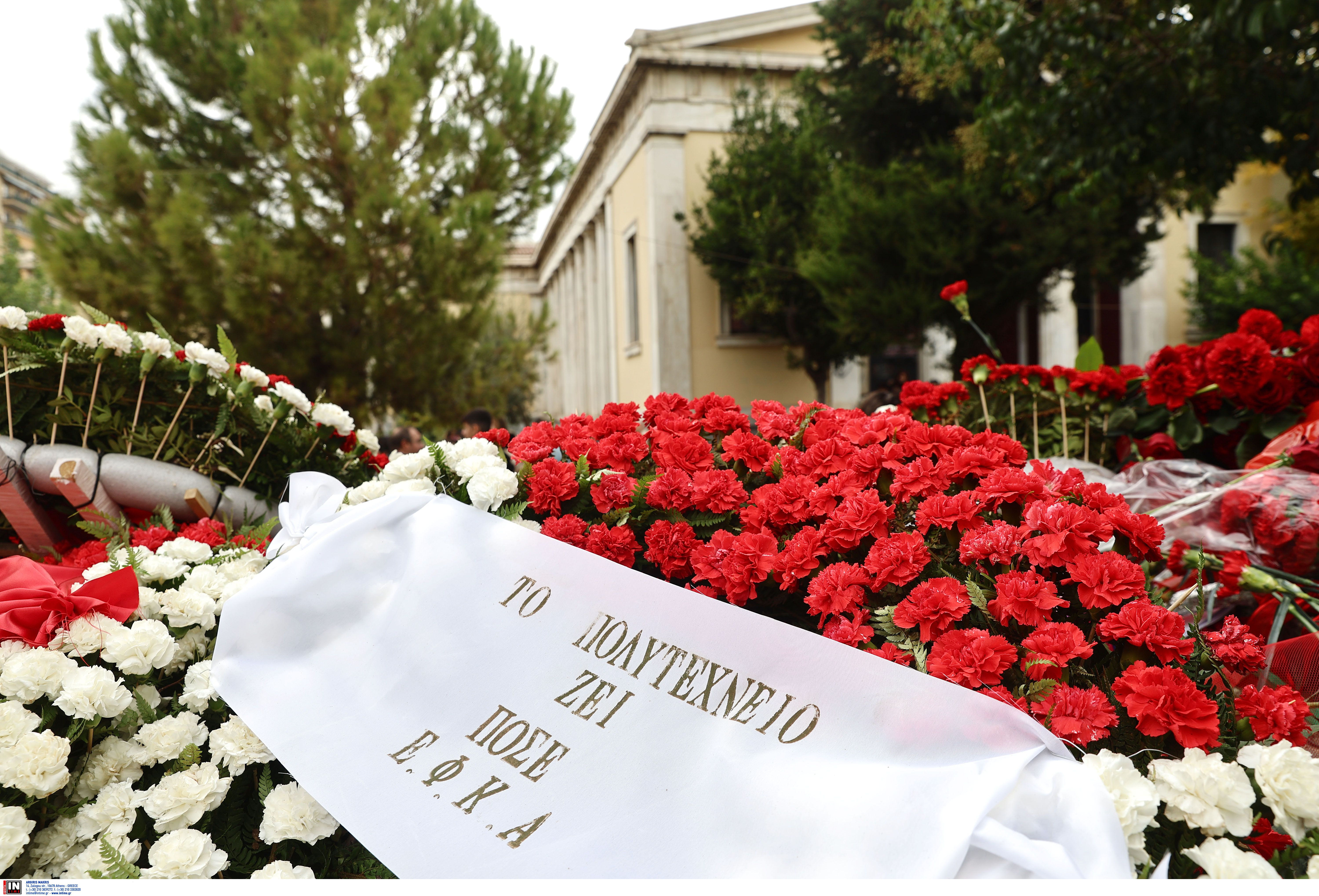 Από νωρίς το πρωί στον χώρο του Πολυτεχνείου έχουν σπεύσει φοιτητές, εργαζόμενοι, μαθητές με τα σχολεία τους αφήνοντας λουλούδια και παιδικές ζωγραφιές στην πεσμένη πόρτα και την κεφαλή, το γλυπτό που συμβολίζει όσους χάθηκαν την 17η Νοεμβρίου.