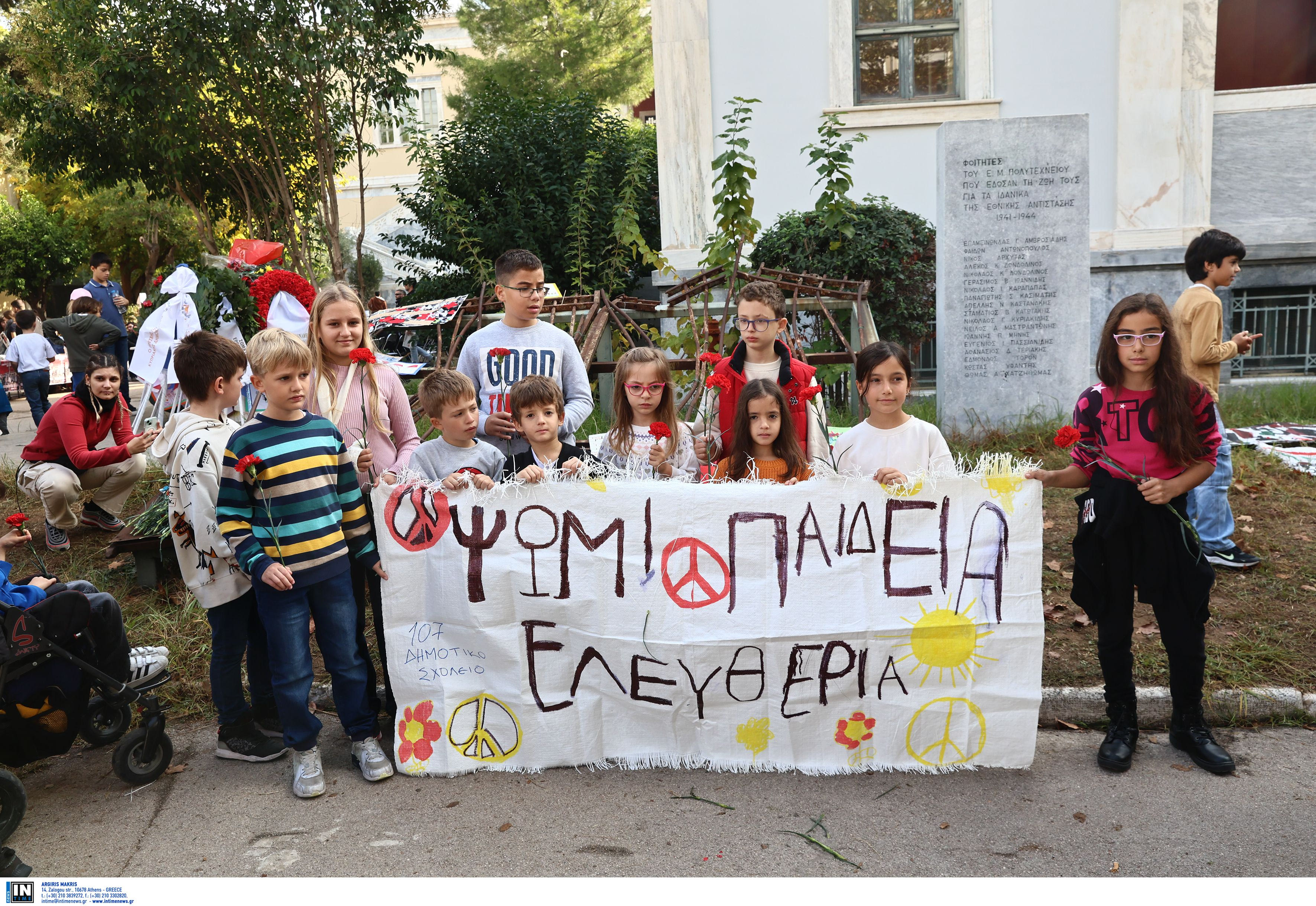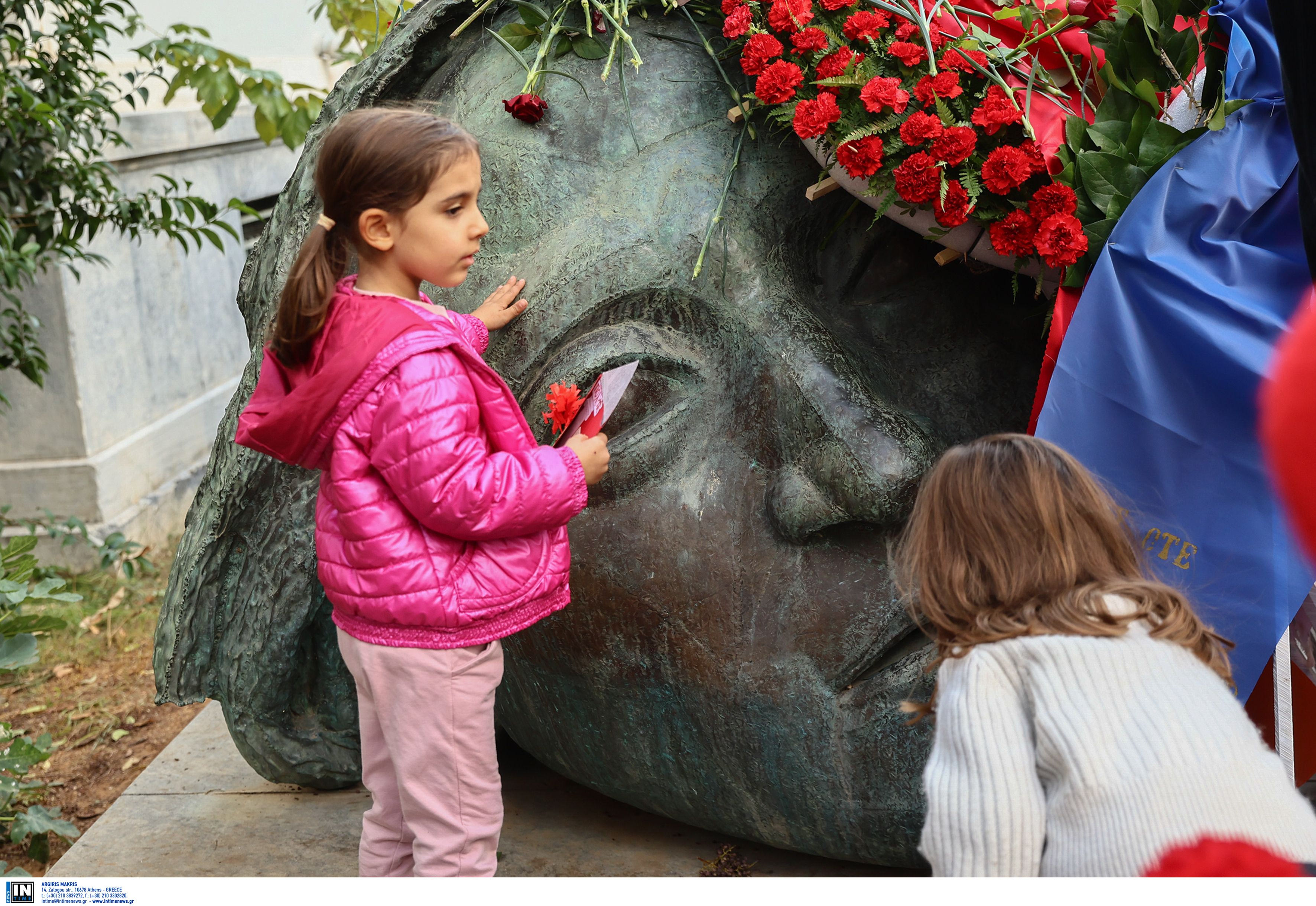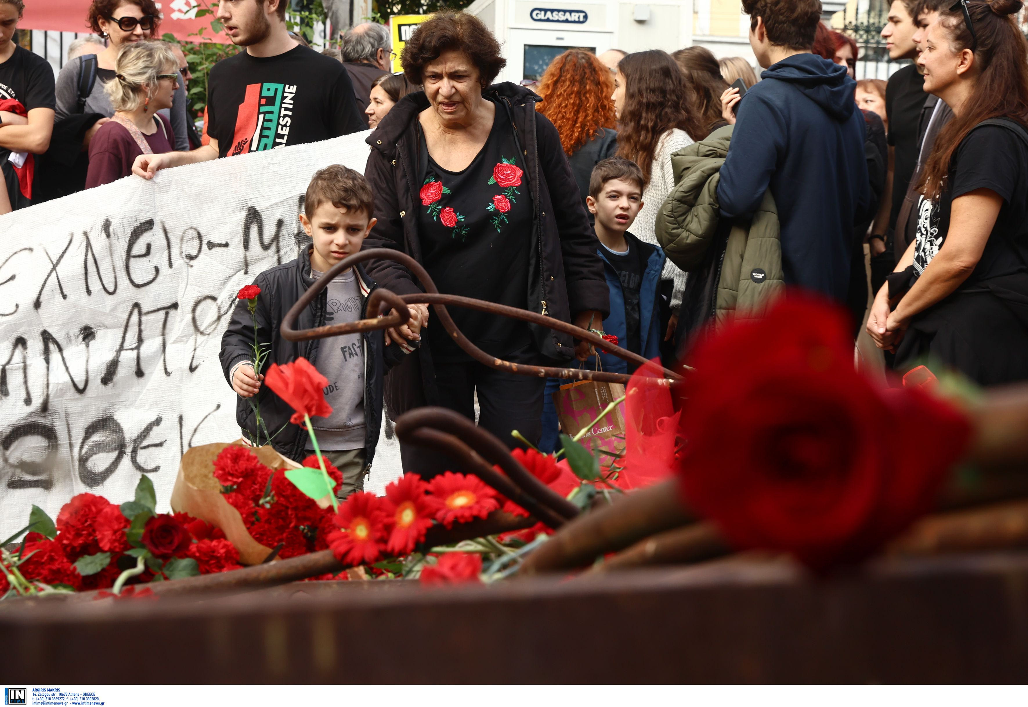 Από νωρίς το πρωί στον χώρο του Πολυτεχνείου έχουν σπεύσει φοιτητές, εργαζόμενοι, μαθητές με τα σχολεία τους αφήνοντας λουλούδια και παιδικές ζωγραφιές στην πεσμένη πόρτα και την κεφαλή, το γλυπτό που συμβολίζει όσους χάθηκαν την 17η Νοεμβρίου.