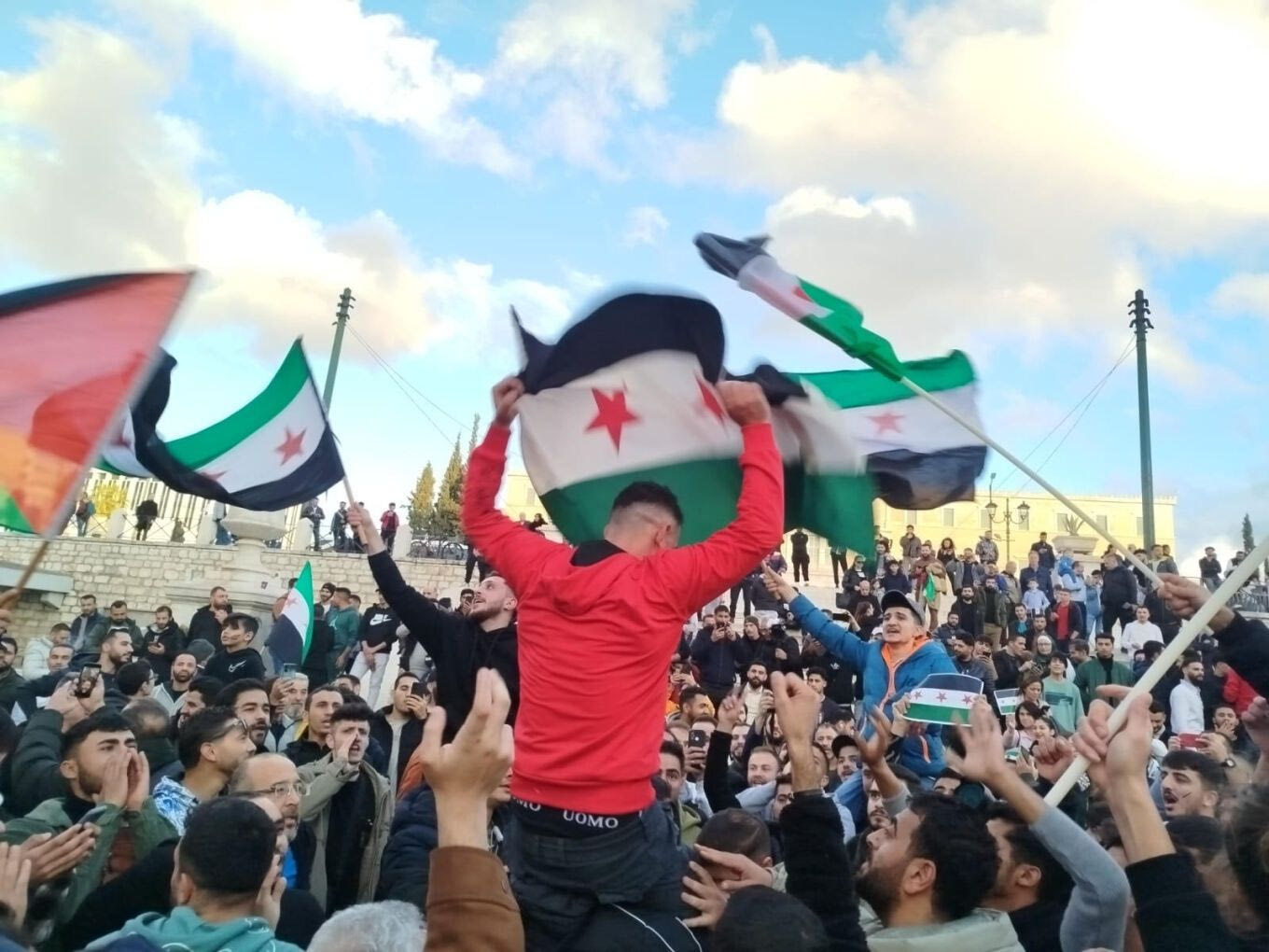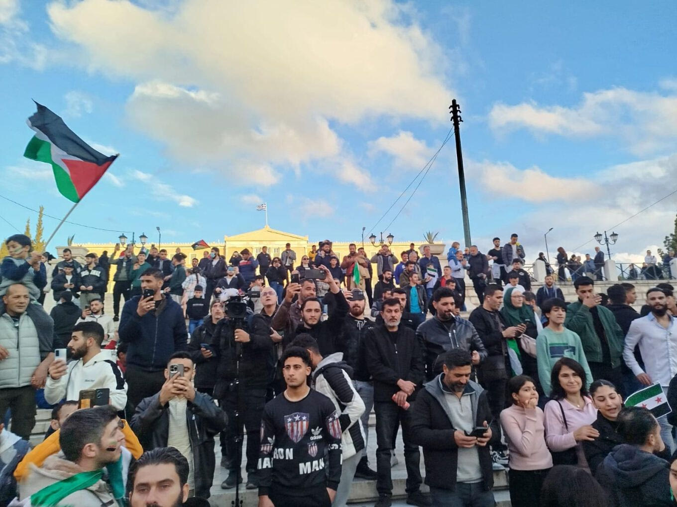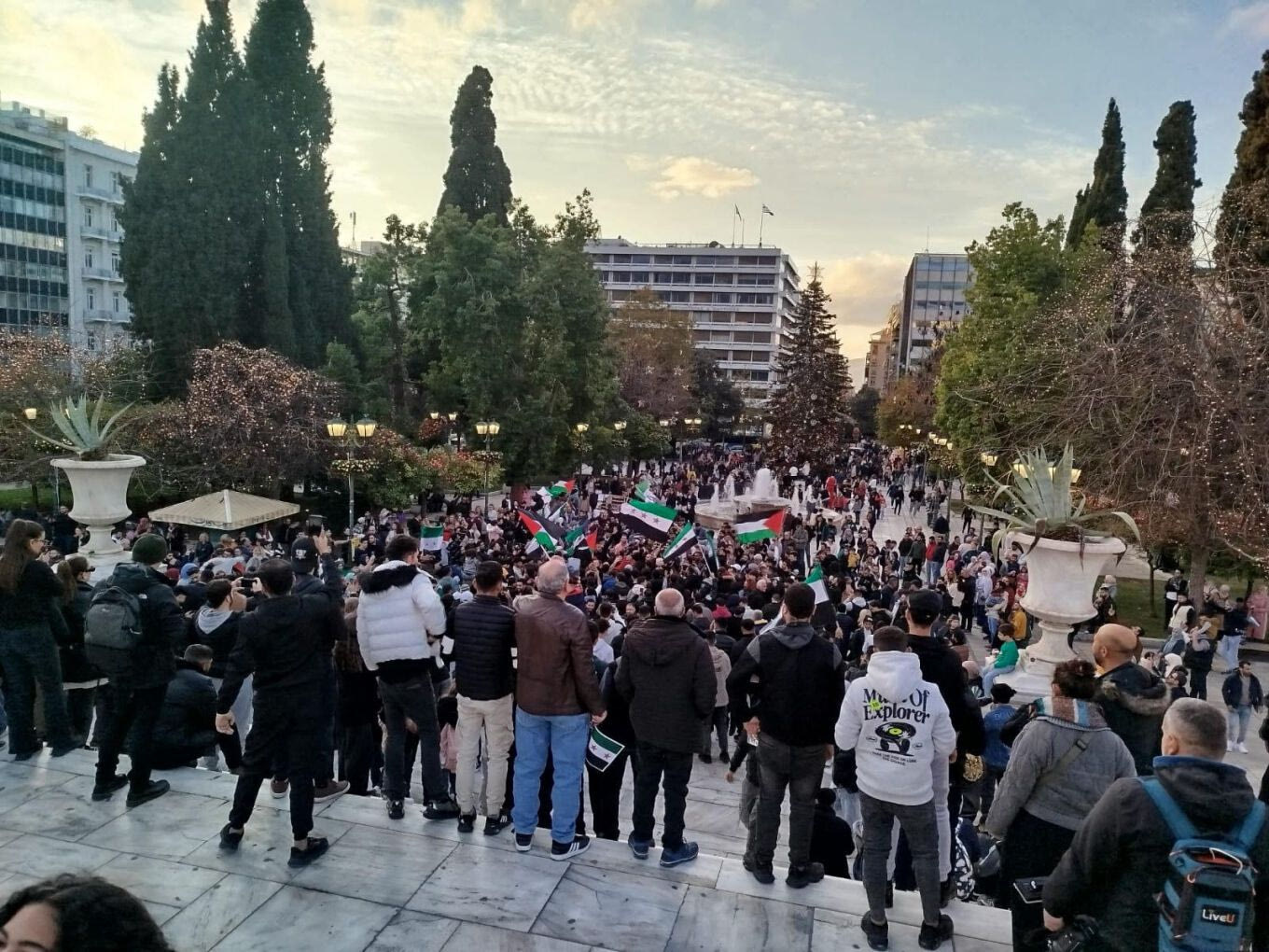 Νέοι άνθρωποι, γονείς με τα παιδιά τους και ηλικιωμένοι δηλώνουν συγκινημένοι για το τέλος όπως λένε της πολυετούς δικτατορίας Άσαντ. Η αστυνόμευση στην πλατεία Συντάγματος είναι διακριτική.