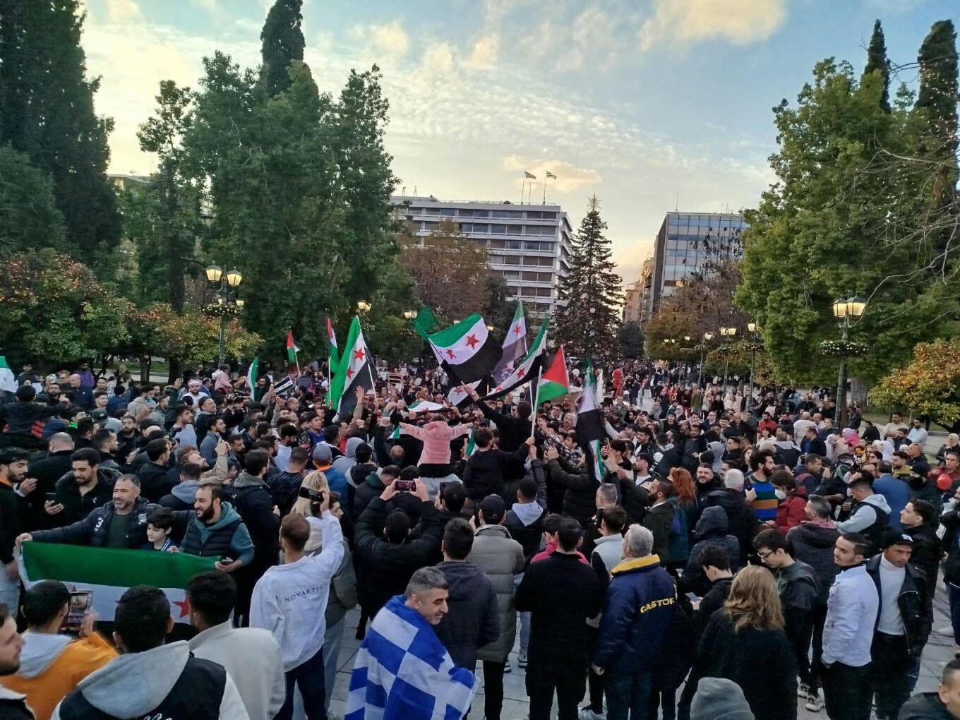 Εκατοντάδες Σύροι πρόσφυγες συγκεντρώνονται αυτήν την ώρα στην πλατεία Συντάγματος όπου ανεμίζοντας σημαίες της χώρας τους, τραγουδώντας και φωνάζοντας συνθήματα, πανηγυρίζουν για την ανατροπή του καθεστώτος του Μπασάρ Αλ Άσαντ.