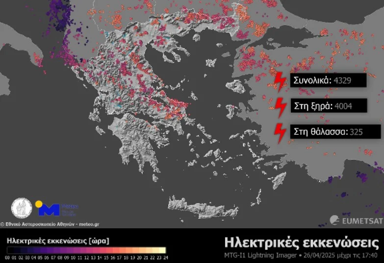 Περισσότεροι από 4.000 κεραυνοί «χτύπησαν» τη χώρα μέχρι τις 17:40 του Σαββάτου (26/4).