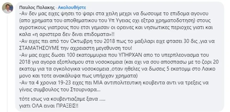 -Αν μας είχες δώσει 100 εκατομμύρια που ΥΠΗΡΧΑΝ απο το υπερπλεόνασμα του 2018 για αγορά εξοπλισμού στα νοσοκομεία (και όχι να σου αποσπάσω με το ζόρι 20 εκατ. για τα ογκολογικά νοσοκομεία, όταν ήθελες να δώσεις 5 εκατ. στο Λαϊκό μόνο και τότε ανακάλυψα πως υπήρχαν χρήματα)
