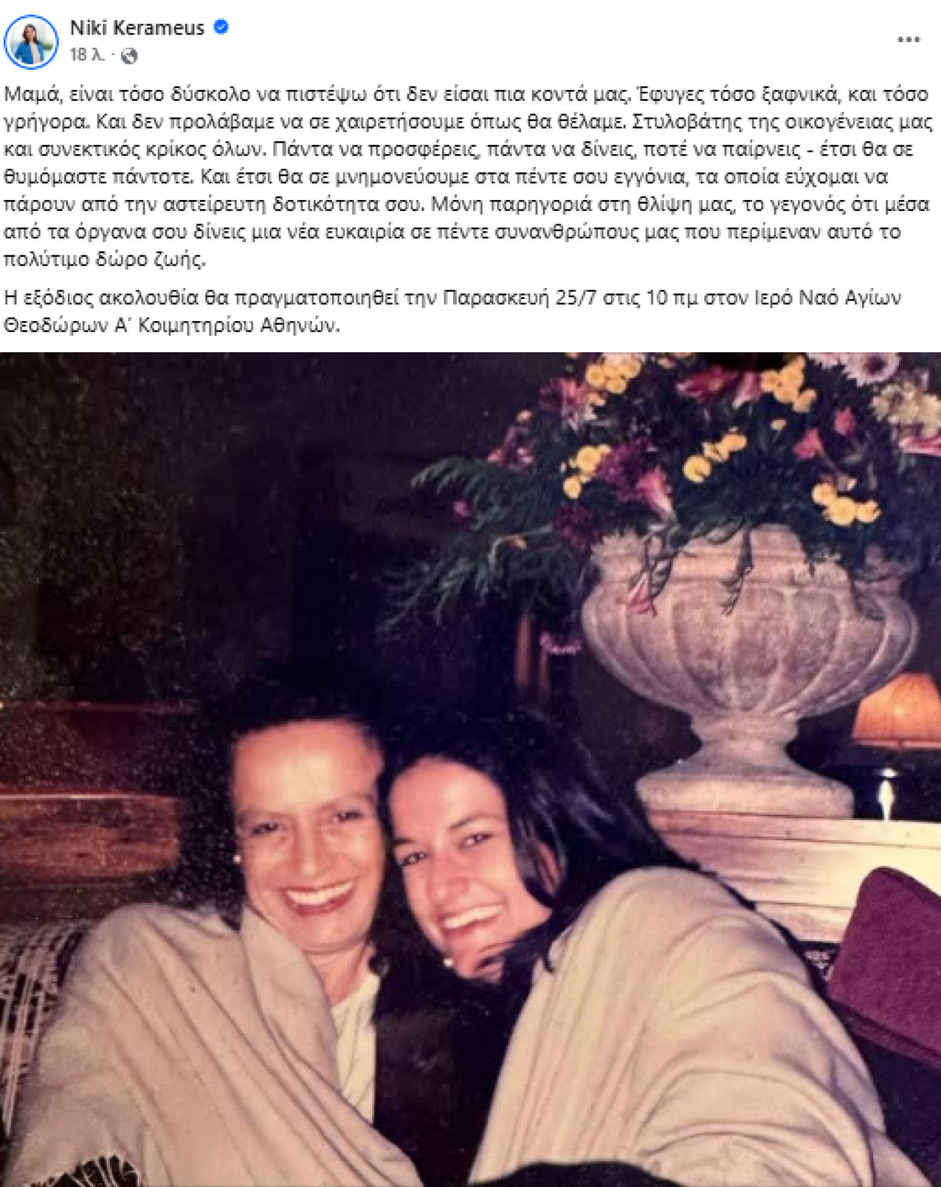 Δύσκολες ώρες για την υπουργό Εργασίας και βουλευτή της ΝΔ Νίκη Κεραμέως, καθώς άφησε την τελευταία της πνοή η μητέρα της. Μέσα από ανάρτησή της στο Facebook, η κυρία Κεραμέως αναφέρθηκε στον χαρακτήρα της μητέρας της και σημείωσε πως «μόνη παρηγοριά στη θλίψη μας, το γεγονός ότι μέσα από τα όργανα σου δίνεις μια νέα ευκαιρία σε πέντε συνανθρώπους μας».
