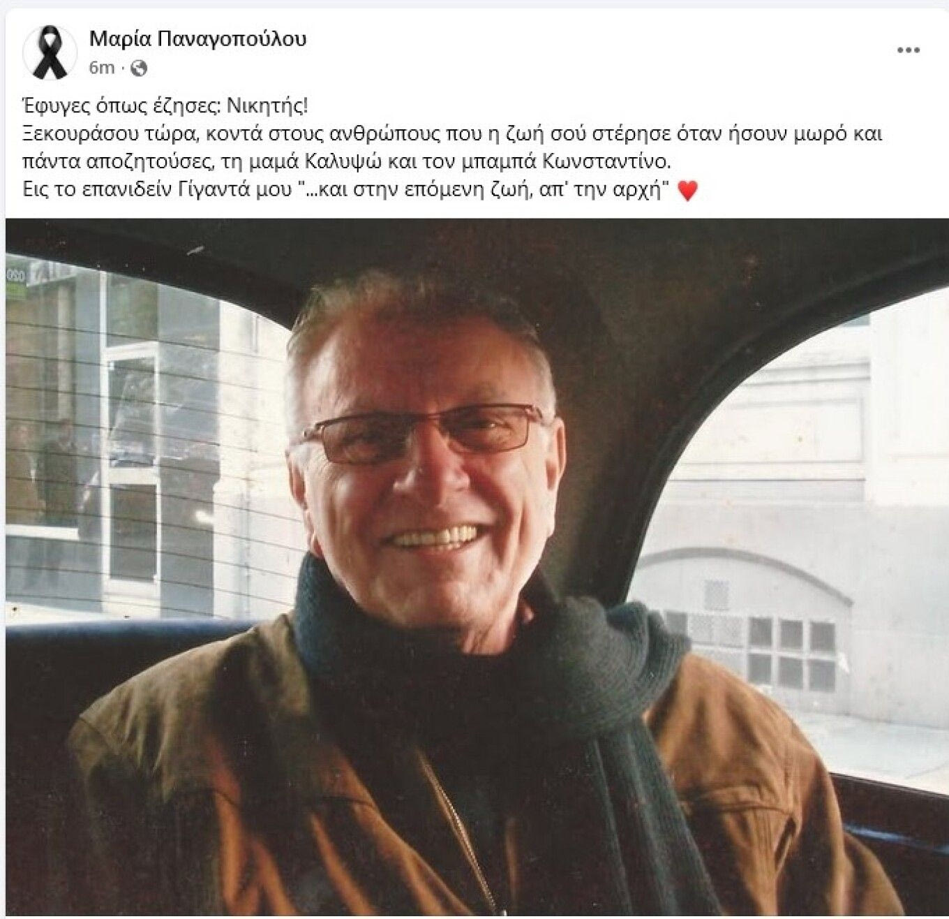 Σε ανάρτησή της, μετά τον θάνατό του, η σύζυγός του Μαρία Παναγοπούλου γράφει:
