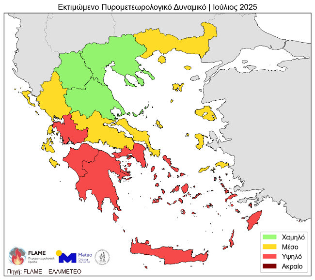 Οι διαθέσιμες εποχικές προγνώσεις υποδεικνύουν αρκετά υψηλότερες θερμοκρασίες και συνθήκες έντονης ατμοσφαιρικής ξηρασίας για τον Ιούλιο 2025. Οι συνθήκες αυτές εκτιμάται ότι θα αναβαθμίσουν το πυρομετεωρολογικό δυναμικό: