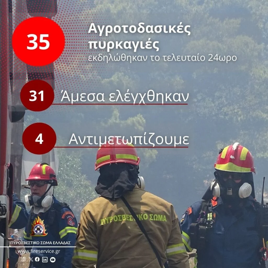 35 αγροτοδασικές πυρκαγιές εκδηλώθηκαν σε ένα 24ωρο, από τις οποίες οι 31 αντιμετωπίστηκαν άμεσα, στο αρχικό τους στάδιο, ενώ οι πυροσβεστικές δυνάμεις αντιμετωπίζουν ακόμη τέσσερις.